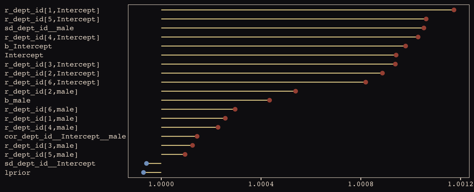 And if you wanted a one-sided Bayesian \(p\)-value for the male dummy for the full model, you execute something like this.