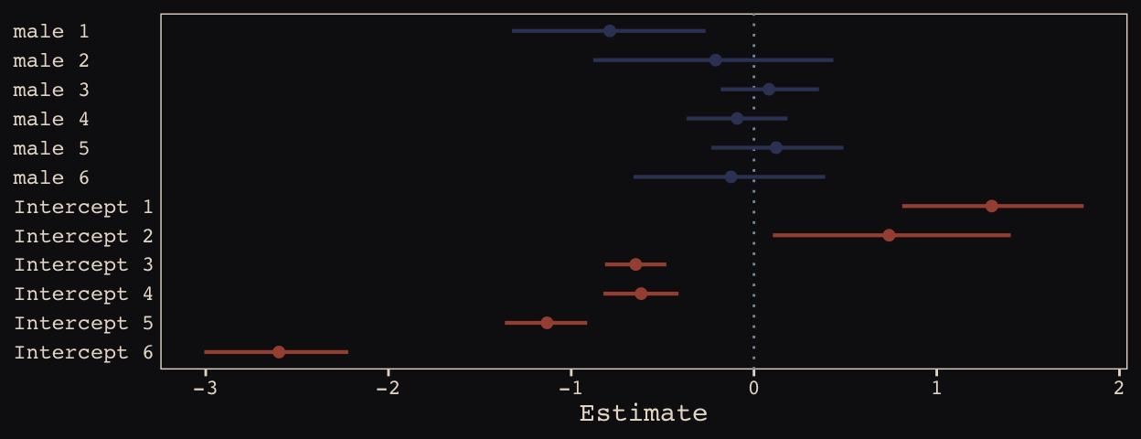 Note how the 95% intervals for all the random male slopes contain zero within their bounds. Here are the fixed effects.