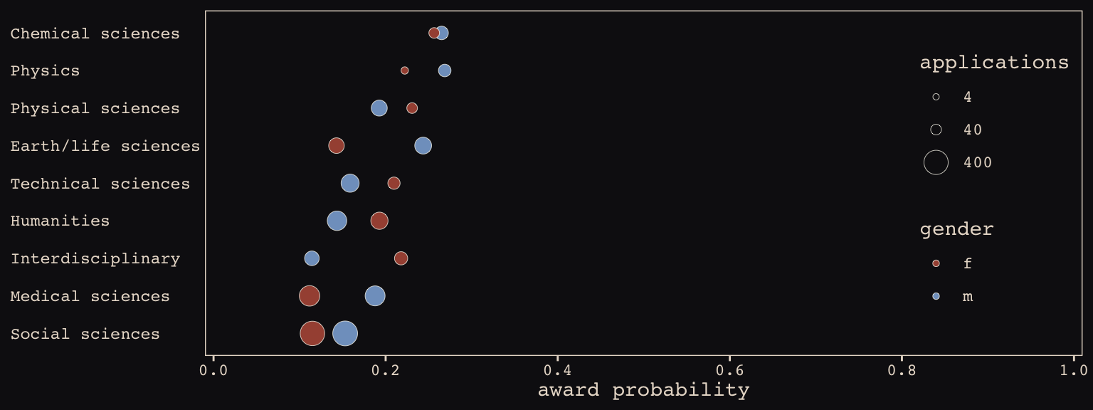 Pretty small. But recall how Simpson’s paradox helped us understand the Berkeley data. [If you need a refresher on Simpson’s paradox, go here.] Different departments in Berkeley had different acceptance rates AND different ratios of male and female applicants. Similarly, different academic disciplines in the Netherlands might have different award rates for funding AND different ratios of male and female applications.