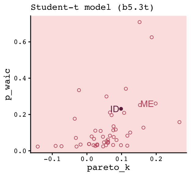 l <-tibble(pareto_k = b5.3t$criteria$loo$diagnostics$pareto_k,p_waic = b5.3t$criteria$waic$pointwise[, "p_waic"],Loc =pull(d, Loc)) l |>ggplot(aes(x = pareto_k, y = p_waic, color = Loc =="ID")) +geom_point(aes(shape = Loc =="ID")) +geom_text(data = l |>filter(Loc %in%c("ID", "ME")),aes(x = pareto_k -0.005, label = Loc),hjust =1) +scale_color_manual(values =carto_pal(7, "BurgYl")[c(5, 7)]) +scale_shape_manual(values =c(1, 19)) +labs(subtitle ="Student-t model (b5.3t)") +theme(legend.position ="none")