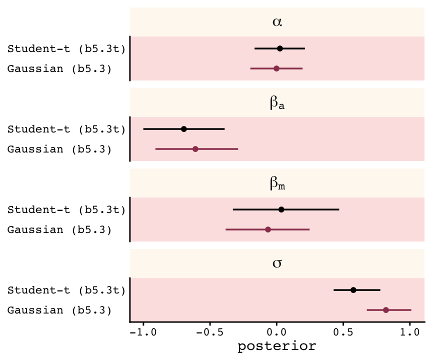 Overall, the coefficients are very similar between the two models. The most notable difference is in \(\sigma\). This is, in part, because \(\sigma\) has a slightly different meaning for Student-\(t\) models than it does for the Gaussian. For both, we can refer to \(\sigma\) as the scale parameter, with is a measure of spread or variability around the mean. However, the scale is the same thing as the standard deviation only for the Gaussian. Kruschke walked this out nicely:
