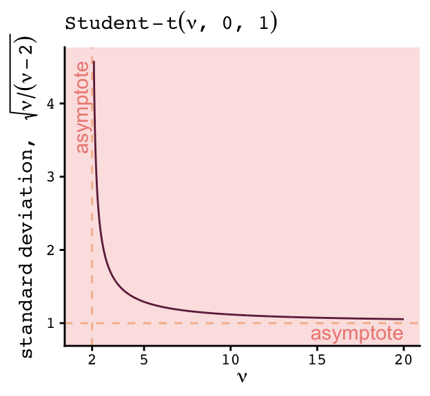 # For the annotationtext <-tibble(nu =c(1.35, 20),sd =c(sqrt(2.1/ (2.1-2)), 0.875),angle =c(90, 0),hjust =1,label ="asymptote")# Wrangletibble(nu =seq(from =2.1, to =20, by =0.01)) |>mutate(var = nu / (nu -2)) |>mutate(sd =sqrt(var)) |># Plotggplot(aes(x = nu, y = sd)) +geom_hline(yintercept =1, color =carto_pal(7, "BurgYl")[2], linetype =2) +geom_vline(xintercept =2, color =carto_pal(7, "BurgYl")[2], linetype =2) +geom_text(data = text,aes(label = label, angle = angle, hjust = hjust),color =carto_pal(7, "BurgYl")[3]) +geom_line(color =carto_pal(7, "BurgYl")[7]) +scale_x_continuous(expression(nu), breaks =c(2, 1:4*5)) +labs(y =expression(standard~deviation*", "*~sqrt(nu/(nu-2))),subtitle =expression(Student-t(nu*', '*0*', '*1)))