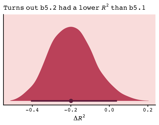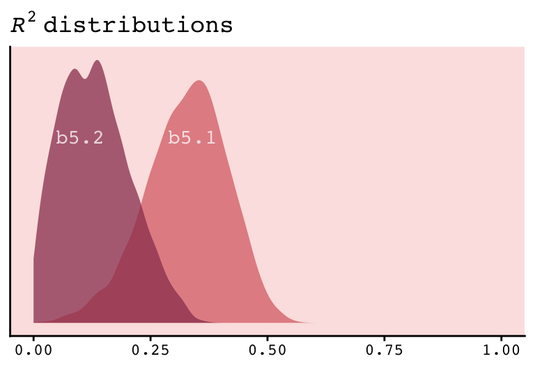 At the beginning of the chapter (pp. 193–201), McElreath introduced \(R^2\) as a popular way to assess the variance explained in a model. He pooh-poohed it because of its tendency to overfit. It’s also limited in that it doesn’t generalize well outside of the single-level Gaussian framework, which will be a big deal for us starting in Chapter 10. However, if you should find yourself in a situation where \(R^2\) suits your purposes, the brmsbayes_R2() function might be of use. Simply feeding a model brm() fit object into bayes_R2() will return the posterior mean, \(\textit{SD}\), and 95% intervals. For example: