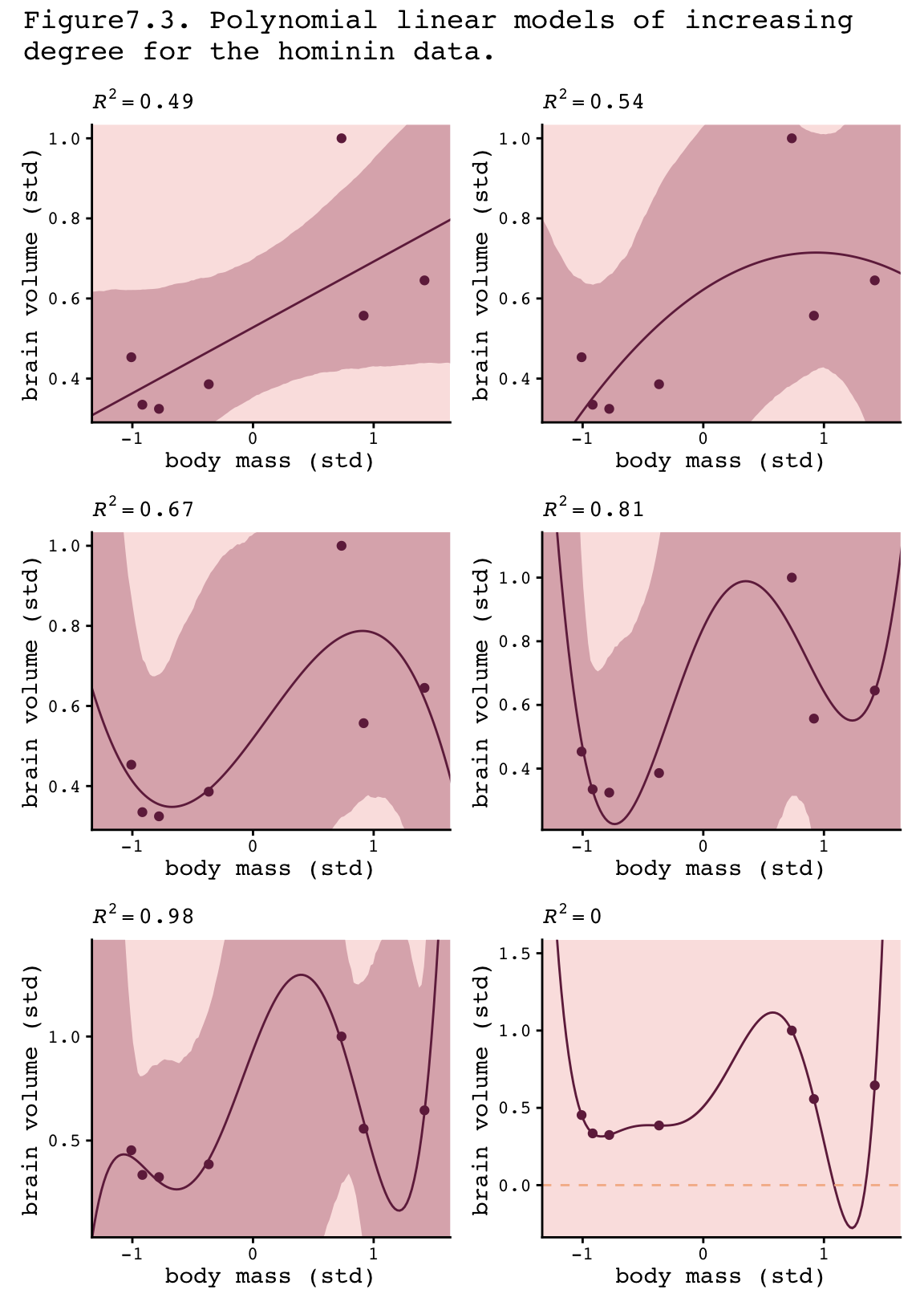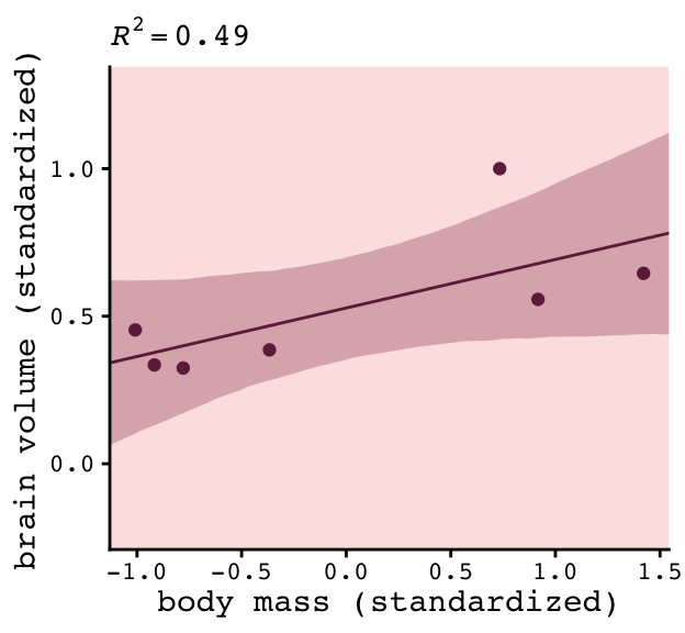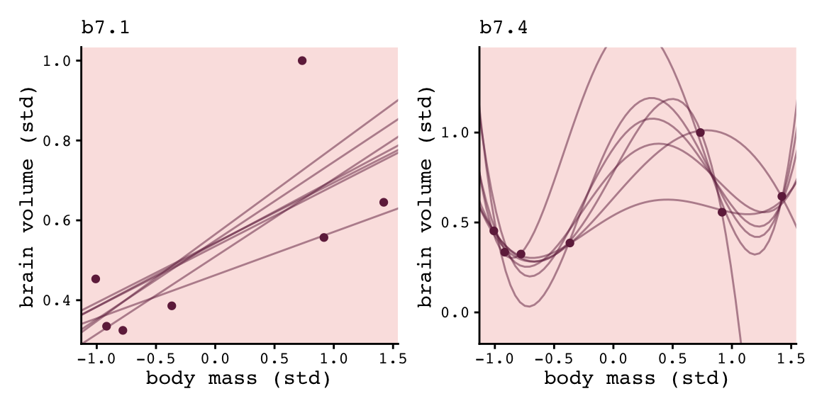make_figure7.3<-function(brms_fit, ylim =range(d$brain_std)) {# Compute the R2 r2 <-R2_is_bad(brms_fit)# Define the new data nd <-tibble(mass_std =seq(from =-2, to =2, length.out =200))# Simulate and wranglefitted(brms_fit, newdata = nd, probs =c(0.055, 0.945)) |>data.frame() |>bind_cols(nd) |># Plot! ggplot(aes(x = mass_std)) +geom_lineribbon(aes(y = Estimate, ymin = Q5.5, ymax = Q94.5),color =carto_pal(7, "BurgYl")[7], linewidth =1/2, fill =alpha(carto_pal(7, "BurgYl")[6], 1/3)) +geom_point(data = d,aes(y = brain_std),color =carto_pal(7, "BurgYl")[7]) +labs(x ="body mass (std)",y ="brain volume (std)",subtitle =bquote(italic(R)^2==.(round(r2, digits =2)))) +coord_cartesian(xlim =c(-1.2, 1.5),ylim = ylim)}