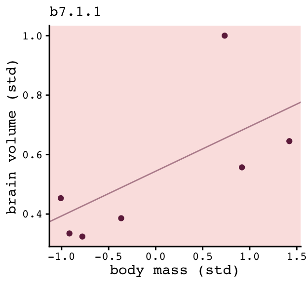b7.1<-brm(data = d, family = gaussian, brain_std ~1+ mass_std,prior =c(prior(normal(0.5, 1), class = Intercept),prior(normal(0, 10), class = b),prior(lognormal(0, 1), class = sigma)),iter =2000, warmup =1000, chains =4, cores =4,seed =7,file ="fits/b07.01")