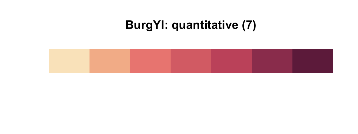 The specific palette we’ll be using is “BurgYl.” In addition to palettes, the rcartocolor package offers a few convenience functions which make it easier to use their palettes. The carto_pal() function will return the HEX numbers associated with a given palette’s colors and the display_carto_pal() function will display the actual colors.