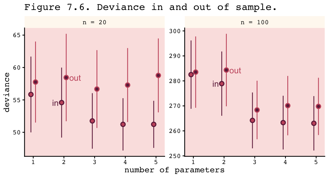 The overfit polynomial models fit the data extremely well, but they suffer for this within-sample accuracy by making nonsensical out-of-sample predictions. In contrast, underfitting produces models that are inaccurate both within and out of sample. They learn too little, failing to recover regular features of the sample. (p. 201, emphasis in the original)
