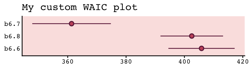 With our brms paradigm, we won’t get a comparison plot by inserting loo_compare(b6.6, b6.7, b6.8, criterion = "waic") within plot(). But with a little [] subsetting and light wrangling, we can convert the contents of our w object to a format suitable for plotting the WAIC estimates with ggplot2.