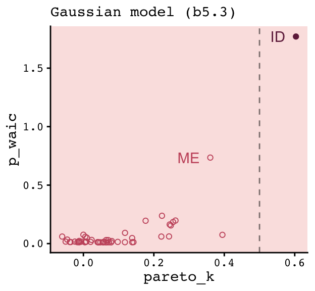 l <-tibble(pareto_k = b5.3$criteria$loo$diagnostics$pareto_k,p_waic = b5.3$criteria$waic$pointwise[, "p_waic"],Loc =pull(d, Loc)) l |>ggplot(aes(x = pareto_k, y = p_waic, color = Loc =="ID")) +geom_vline(xintercept =0.5, linetype =2, color ="black", alpha =1/2) +geom_point(aes(shape = Loc =="ID")) +geom_text(data = l |>filter(p_waic >0.5),aes(x = pareto_k -0.03, label = Loc),hjust =1) +scale_color_manual(values =carto_pal(7, "BurgYl")[c(5, 7)]) +scale_shape_manual(values =c(1, 19)) +labs(subtitle ="Gaussian model (b5.3)") +theme(legend.position ="none")