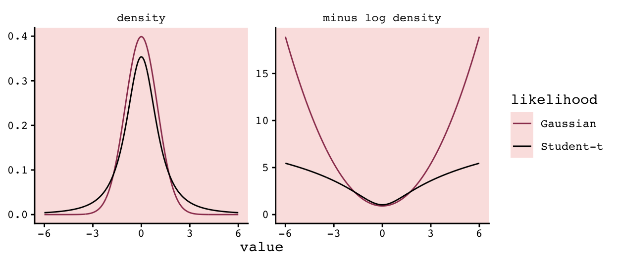 tibble(x =seq(from =-6, to =6, by =0.01)) |>mutate(Gaussian =dnorm(x),`Student-t`=dstudent(x)) |>pivot_longer(-x,names_to ="likelihood",values_to ="density") |>mutate(`minus log density`=-log(density)) |>pivot_longer(contains("density")) |>ggplot(aes(x = x, y = value, group = likelihood, color = likelihood)) +geom_line() +scale_color_manual(values =c(carto_pal(7, "BurgYl")[6], "black")) +ylim(0, NA) +labs(x ="value", y =NULL) +facet_wrap(~ name, scales ="free_y") +theme(strip.background =element_blank())