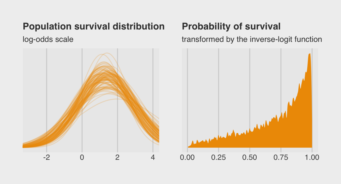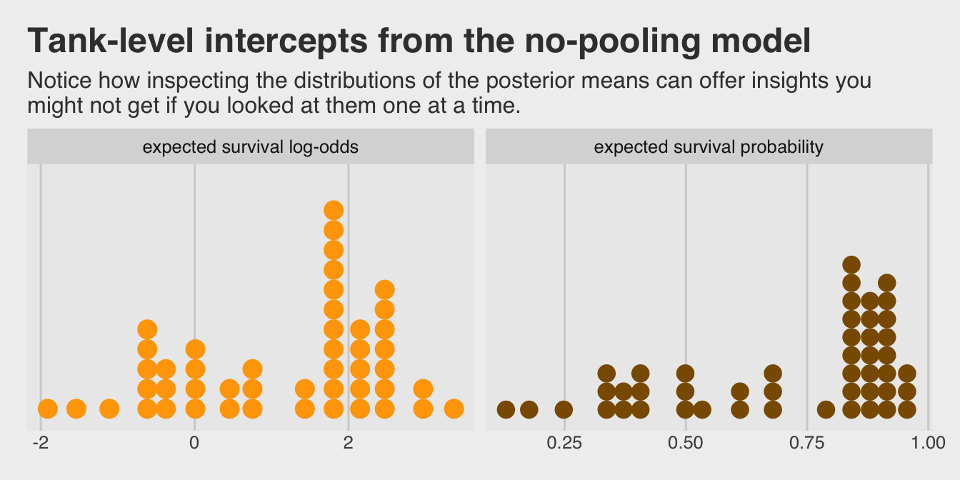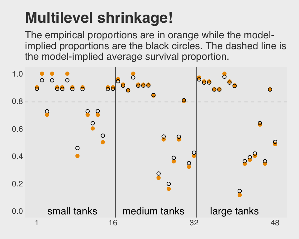 \[\begin{align*} \text{surv}_i & \sim \operatorname{Binomial}(n_i, p_i) \\ \operatorname{logit}(p_i) & = \alpha_{\text{tank}[i]} \\ \alpha_j & \sim \operatorname{Normal} (0, 1.5) & \text{for } j = 1, \dots, 48, \end{align*}\]