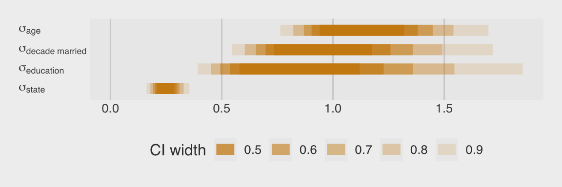 Remember how small the posterior for \(\sigma_\text{state}\) was relative to the other \(\sigma_\text{<group>}\) posteriors? We said that would imply more aggressive regularization across states. You can really see that regularization in the panels showing the multilevel and MRP estimates. They are much more uniform than the proportions from the raw data, which are all over the place. This is why you use multilevel models and/or stratify. When you divide the responses up at the state level, the proportions get jerked all around due to small and unrepresentative samples. Even with the regularization from the multilevel partial pooling, you can still see some interesting differences in the multilevel and MRP panels. Both suggest women keep their maiden names in relatively low proportions in Utah and relatively high proportions in New York. For those acquainted with American culture, this shouldn’t be a great surprise.