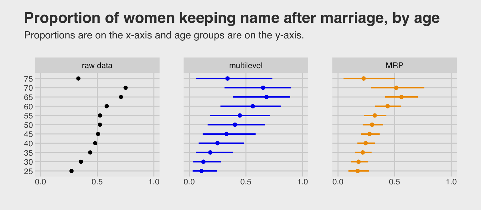 Both multilevel and MRP estimates tended to be a little lower than the raw proportions, particularly for women in the younger age groups. Alexander mused this was “likely due to the fact that the survey has an over-sample of highly educated women, who are more likely to keep their name.” The MRP estimates were more precise than the multilevel predictions, which averaged across the grouping variables other than age. All three estimates show something of an inverted U-shape curve across age, which Alexander noted “is consistent with past observations that there was a peak in name retention in the 80s and 90s.”