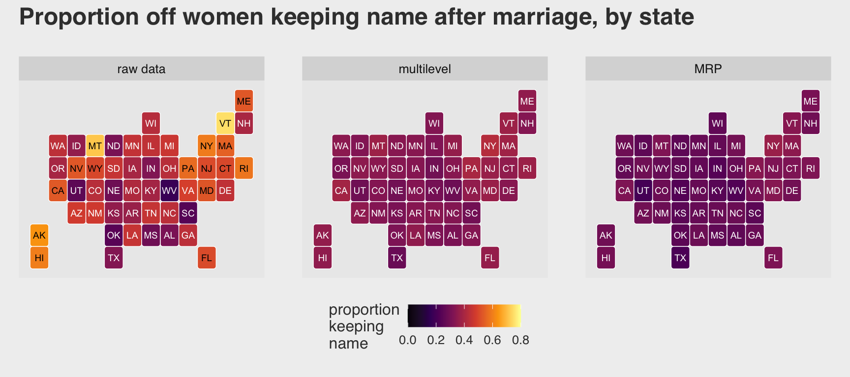plot_annotation(title = "Proportion off women keeping name after marriage, by state",